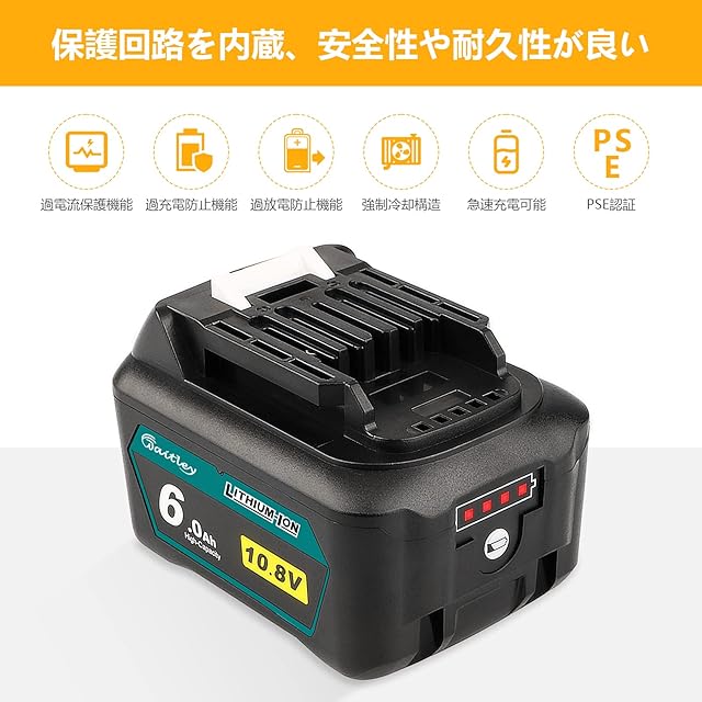 【低不良率】本製品はPSE・CEマーク取得済です。安心してご使用いただけます。それに、この10.8vバッテリーは出荷前に 専門的な検査機械で十分に検査された高品質なマキタ互換バッテリーで、少ない不良率を実現しています。【ご注意:】バッテリーの寿命を保護するために、バッテリーを使用完了後に、電動工具から取り外すようにご注意ください。