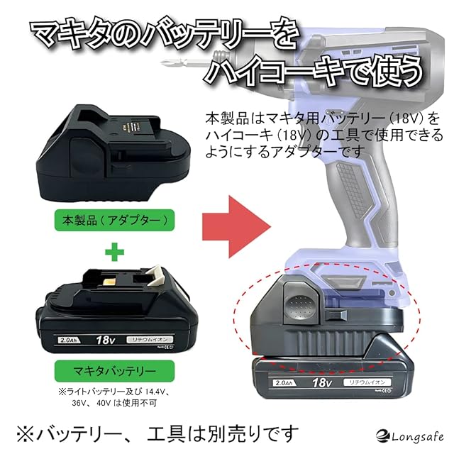 安心のブランド「 Longsafe 」<br> <br> ◆この商品にマキタバッテリーをセットすればハイコーキ(日立)の工具が使えます!<br> <br> ◆電動工具は使用するメーカーによってバッテリーが異なり互換性もありません。<br> そんな時でもマキタバッテリーでハイコーキ電動工具を使用出来るようにする変換アダプターです。<br> <br> ◆互換性商品ですが以下のマキタ純正バッテリーに対応しております。<br> BL1820 BL1830B BL1850 BL1850B BL1860 BL1860B BL1890 BL1890B<br> ※14.4V、ライトバッテリー、マルチボルト36Vには対応しておりません<br> ※バッテリー、充電器は別売り<br> <br> 【ご注意】<br> このアダプターはバッテリーの充電には使用できません。危険ですのでアダプターを付けたままでの充電はしないでください。<br> ツールの電源を切り、アダプターからバッテリーを取り外してからバッテリー対応の充電器にて充電してください<br> <br> ◆メーカー推奨使用方法ではない為、ご利用は自己責任にてお願いします。<br> ◆万が一の機器の故障の場合、責任は負いかねます。<br> ◆アダプター使用時はバッテリー残量が完全になくなる前に充電してください。<br>