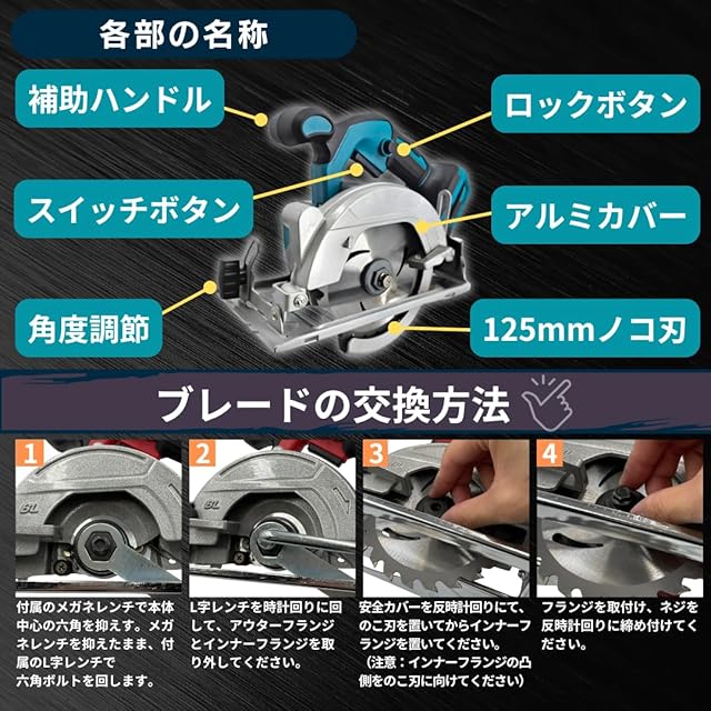 マキタ互換品 充電式 丸のこ 替刃 セット まるのこ 丸ノコ マルノコ 丸鋸 電動工具 ブラシレス のこぎり 電気のこぎり 電ノコ 電鋸 チップソー 電動工具 長続航 木材 合板 コードレス 電動 18V 14.4V バッテリー 刃 刃外径125mm 対応 ※ バッテリー 充電器 別売 (125mm)(MAR12501-BL-MN125K01-SET)