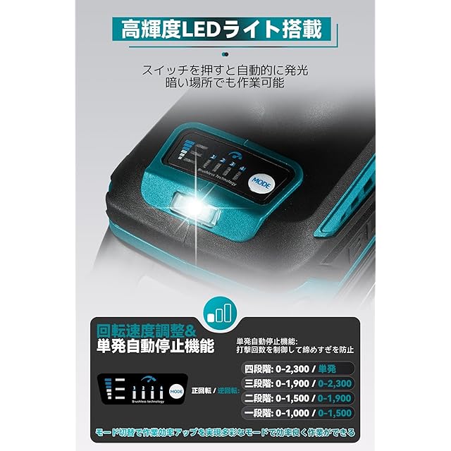 【3速度切り替え可能&単発自動停止】 インパクトドライバーは合計5段階の調整が可能です。 正回転速度は3段階、逆回転速度は2段階調整が可能です。逆回転4段階は単発停止機能であり、ネジが回転しすぎないようにすることができます。 用途に応じて、インパクトドライバーの段階を調整することができ、電力を節約して長時間使用するのに役立ちます。