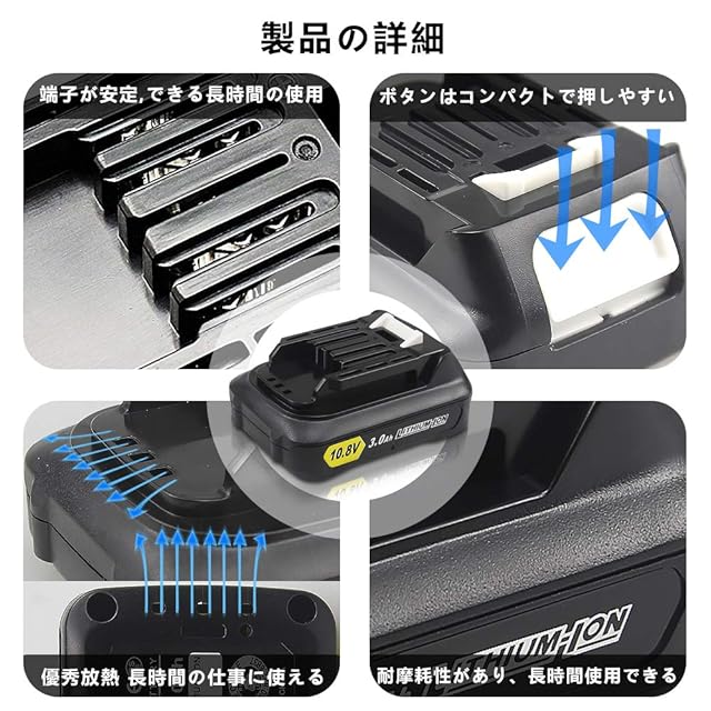 ★強制冷却:自己放電が少ないため、長期保存しても満充電 に近い作業が可能です制御基板には充電を制御する保護回路を搭載!安定性に定評のあるセル搭載、高品質モデル 10.8v バッテリーです