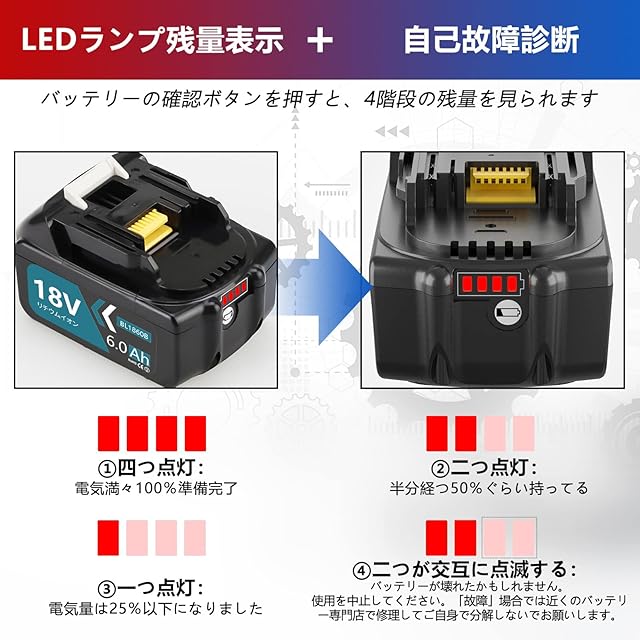 【マキタ18v 対応機種】インパクトドライバ 草刈機 掃除機、チェーンソー、集塵機、ブロアー、空気入れなど18Vの機種:TD171DRGX、TD149DRFX、TP141DRGX/TP141DRTX、TW285DRGX、HP481DRGX/HP481DRTX、HR244DRGX、LS610DRG/DZ、TM51DRG/TM51DRT/TM51DRM/TM51DRF、HS611DRGX、HS631DGXS、HS631DRGX、JV182DRF、KS511DRGX、JR188DRGX/JR188DRG、JR184DRF、MUB184DRGX、UB182DRF、GA404DRGXN/GA404DRGN/GA504DRGXN/GA504DRGN、MUC254DRGX/DGXR、CL281FDRFW/CL281FDFCW、CL282FDRFW/CL282FDFCW、CL182FDRFW、CL180FDRFW/ CL180FDZW、CL181FDRF/W、 MHW080DPG2など(マキタ純正 バッテリー対応機種に準ずます)