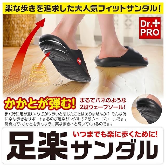 オールシーズン対応! サイズは23~25.5cm(S~M女性向け)、26~27.5cm(M~L男性向け)の2サイズ、 屋内OK! 屋内ではスリッパとしてご使用いただけます。 まるでバネのような2段ウェーブソール! 歩く時に足が重い、ひざがツラいと感じたことはありませんか? そんな時に楽な歩きをサポートするのが足楽サンダルの2段ウェーブソールです。反発力で、かかとを弾むように楽な歩きへと導いてくれるのです。 片足約90gの軽量の足楽サンダル! 足取りを軽やかにするために軽量仕様の素材を採用しました。歩きが楽になるので近所へのお散歩もOK。