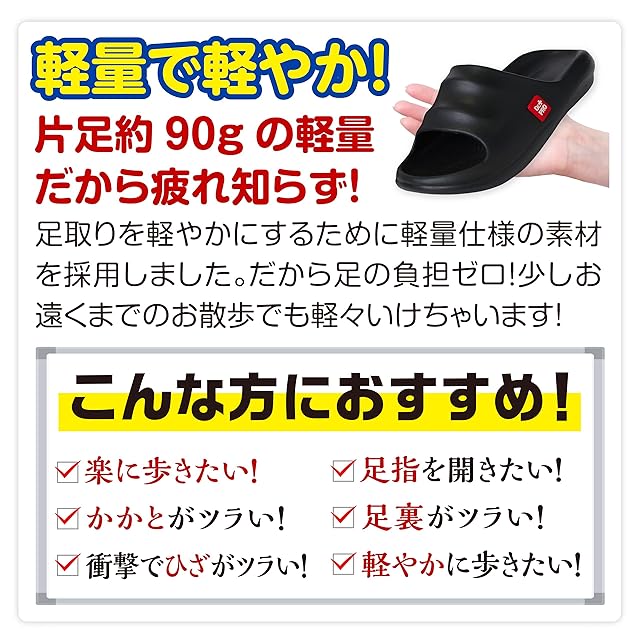 片足約90gの軽量の足楽サンダル! 足取りを軽やかにするために軽量仕様の素材を採用しました。歩きが楽になるので近所のお散歩もOK!