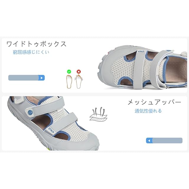 【履きやすい】ワイドトゥボックスで、つま先を圧迫しにくい。甲側とカカトと、3ヶ所のマジックテープでフィット感に応じて調整できて、着脱しやすいし、足形にもフィットしています。