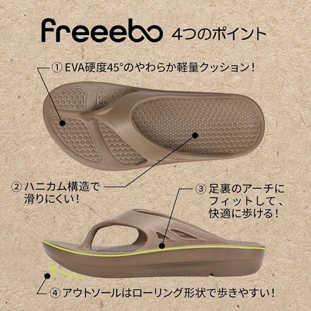 ふわふわ感触でぴたっとフィットする軽量ソフトサンダル。EVA硬度45°の柔らかさと弾むようなクッション性を実現。お買い物やお散歩の他、キャンプなどのレジャー、スポーツの後、海水浴や川遊び、オフィスなどの室内履きまで自由なスタイルで楽しむ一足。シンプルでカラーバリエーション豊富なアイテムです。※EVA硬度は発泡製法により異なる場合がございます。\ freeebo 4つのポイント /1. EVA硬度45°のやわらか軽量クッション2. ハニカム構造で滑りにくい3. 足裏のアーチにフィットして、快適に歩ける4. アウトソールはローリング形状で歩きやすい#リカバリーサンダル #厚底サンダル■アッパー(表面素材):合成樹脂■ヒール高:約3.0cm■ソール(靴底):合成底■ワイズ(足囲):2E相当■生産国:中国製■対応サイズ表M 25.0cmから25.5cmL 26.0cmから26.5cmLL 27.0cmから27.5cmLLL 28.0cmから28.5cm※対応サイズ表示は目安となります。