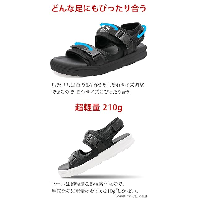 アウトドアブランドのラドウェザー から、まるでスニーカーの様な履き心地のスポーツサンダルが誕生。 ソールはふわふわで弾力性抜群。 衝撃を吸収するから一日中立ちっぱなしでも足が痛くならない。 さらに約4cmの厚底ソールなので、足長効果も抜群。 普段の何気ないファッションも、靴を変えるだけでオシャレにスタイルアップできる。 厚底なのに重量は210gしかないので、長時間歩いても負担にならず疲れない。 秘密はソールに軽量でクッション性も抜群のEVA素材を使用しているから。 爪先、甲、足首の3カ所をそれぞれサイズ調整できるので、甲が高い人も低い人も、幅広の人もどんな足でも自分サイズでぴったりフィット。 爪先と甲は面ファスナーとバックルでしっかり固定できるから、跳んでも走っても緩まず安心。 足首はバックル無しで脱ぎ履きもしやすい。 靴擦れやマメもできないように、内側はクッション性があって柔らかい素材を使用。 履き心地も良い。 オシャレも歩きやすさも両方叶うサンダルは、ヘビロテ間違いないし。
