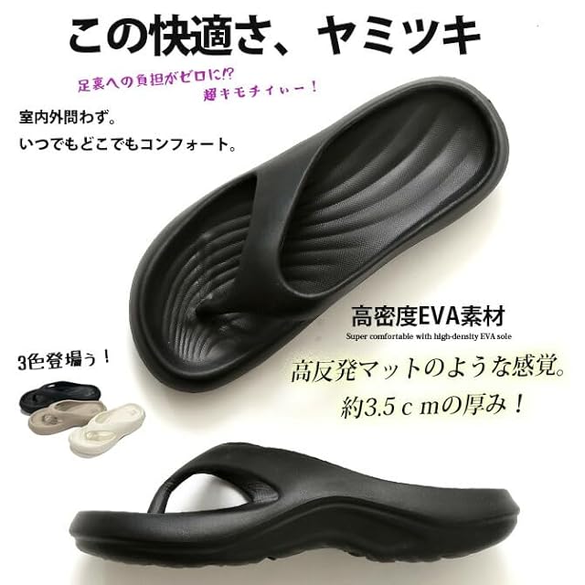 内外問わず。いつでもどこでもコンフォート♪ 「この快適さ、ヤミツキ」足裏の衝撃吸収! 高反発マットのような感覚。約3.5cmの厚みのソール! EVAサンダル特有のふわっともちっとした履き心地はヤミツキ! どんなコーデにも合わせ易いシンプルデザイン! 運動後のリカバリーサンダルとしても選ばるサンダル。 プレゼントにもお勧めです。