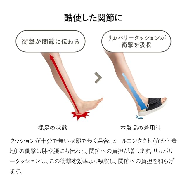 かかと着地時の膝や腰への衝撃をクッションが効率よく吸収し、 関節への負担を和らげます。