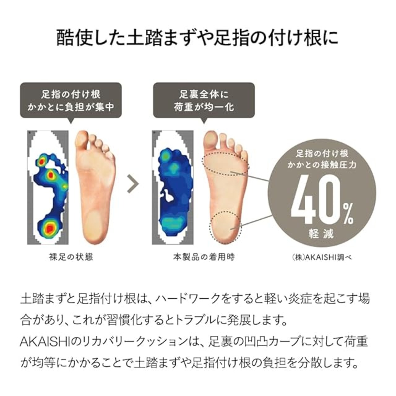 クッションが足裏の凹凸カーブに対して荷重が均等化にかかることで、土踏まずや足指付け根の負担を分散。