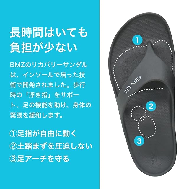 長時間はいても負担が少ない:アシトレサンダルは、インソールメーカーのBMZがインソールで培った技術をもとに開発されました。歩行時の「浮き指」や足の機能をサポートし、筋肉の緊張を緩和します。