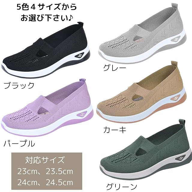 ・【着脱簡単で履きやすい】サッと履けるスリッポンタイプ。簡単な着脱と程よいフィット感。ヒモなしシューズで履きやすく、脱げにくい設計なので室内履きはもちろん、ちょっとしたお出かけなど普段履きに便利な一足です。<br><br>・【軽くて丈夫】片足わずか約190g(24.0cm)の軽いスニーカー。甲部はメッシュ素材を使用し通気性と軽量化を実現しました。滑り止めの効いた靴底は柔らかく軽い素材。摩擦に強く耐久性の高い靴です。<br><br>・【長時間の着用に】疲れにくいレディースシューズ。伸縮の効くメッシュのニット素材で外反母趾の方にもオススメです。また、厚底ソールが衝撃を吸収し、歩きやすい設計です。さらに厚底高3cmで足が長く見える美脚効果もあります。<br><br>・【実用的】様々なシーンで活用できます。室内履きを中心とした立ち仕事、看護のお仕事やオフィス、店舗業務。療養中のサンダルとして。室外にはお散歩やウォーキングシューズとしても便利。<br><br>・【サイズ・カラー】靴のサイズは23cm、23.5cm、24cm、24.5cmの4サイズ。カラーはブラック、グレー、グリーン、パープル、カーキの5色ご用意しております。<br><br>