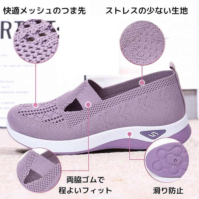 ・【着脱簡単で履きやすい】サッと履けるスリッポンタイプ。簡単な着脱と程よいフィット感。ヒモなしシューズで履きやすく、脱げにくい設計なので室内履きはもちろん、ちょっとしたお出かけなど普段履きに便利な一足です。<br><br>・【軽くて丈夫】片足わずか約190g(24.0cm)の軽いスニーカー。甲部はメッシュ素材を使用し通気性と軽量化を実現しました。滑り止めの効いた靴底は柔らかく軽い素材。摩擦に強く耐久性の高い靴です。<br><br>・【長時間の着用に】疲れにくいレディースシューズ。伸縮の効くメッシュのニット素材で外反母趾の方にもオススメです。また、厚底ソールが衝撃を吸収し、歩きやすい設計です。さらに厚底高3cmで足が長く見える美脚効果もあります。<br><br>・【実用的】様々なシーンで活用できます。室内履きを中心とした立ち仕事、看護のお仕事やオフィス、店舗業務。療養中のサンダルとして。室外にはお散歩やウォーキングシューズとしても便利。<br><br>・【サイズ・カラー】靴のサイズは23cm、23.5cm、24cm、24.5cmの4サイズ。カラーはブラック、グレー、グリーン、パープル、カーキの5色ご用意しております。<br><br>