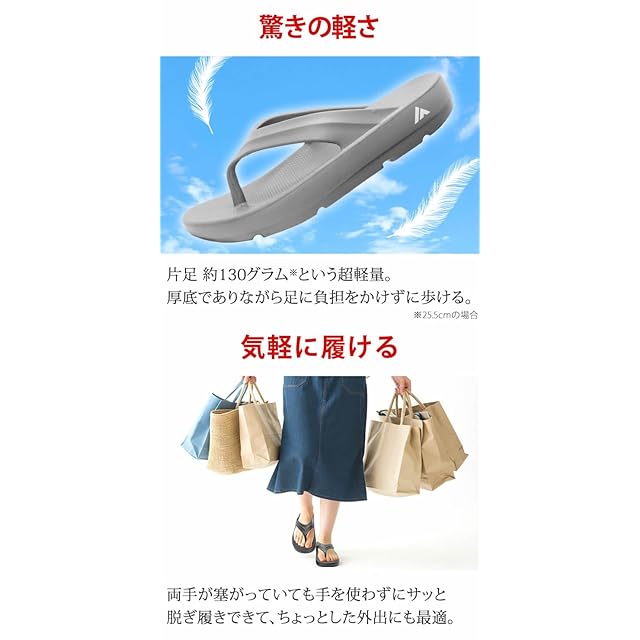 驚きの軽さ:片足 約130グラム※という超軽量。厚底でありながら足に負担をかけずに歩ける。 ※25.5cmの場合