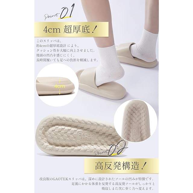 【改良版GAOTEKスリッパが登場!】超軽量設計のルームシューズで、これまでにない素晴らしい履き心地を提供します。機能性①:高品質EVA素材-軽量で耐久性・抗菌防臭性に優れた一体型高密度EVA素材採用します!機能性②:4cmの超厚底設計により、地面の凹凸を感じにくく、ふかふかの履き心地を楽しめます!機能性③:超軽量設計-わずか約130gの軽量デザインで、スリッパの重量を最小限に抑え、足への負担を軽減します!機能性④:高反発構造-深めに設計されたソールのくぼみが、歩くたびに優れた弾力性を発揮します!機能性⑤:滑り止め設計-独自の滑り止めパターンと素材を組み合わせることで、優れたグリップ力を発揮します!さらに静音で歩行快適という驚きの履き心地を実現しました。既存のスリッパのイメージを覆すこの革新的なスリッパは、未経験の素晴らしい快適さをお約束します。