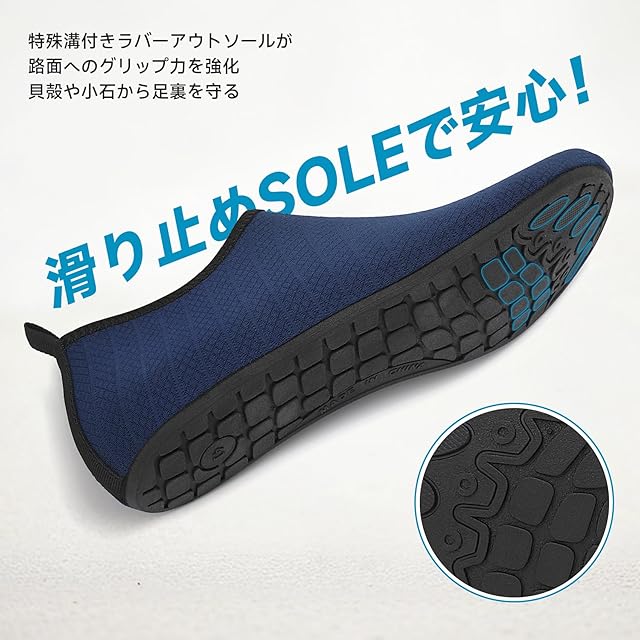 【強化滑り止めソール&足元保護】特殊溝付きラバーソールで岩場や濡れた地面でも安定歩行。合成ゴムのソールが貝殻や小石から足裏を守る。