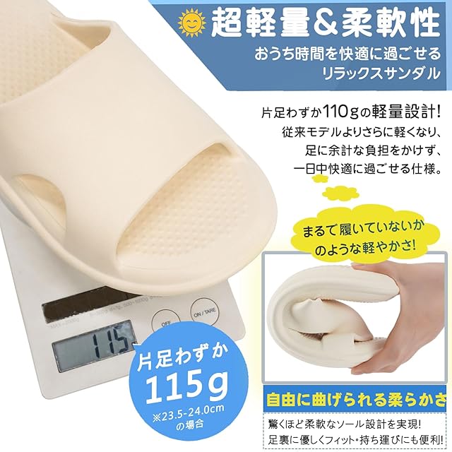 【超軽量&静音設計おうち時間を快適にするリラックスサンダル】片足わずか110gの超軽量設計で、まるで履いていないかのような軽やかさ!長時間履いても足に負担をかけず、一日中快適に過ごせます。さらに、歩くたびに「パタパタ」と響く音を軽減する静音設計を採用。フローリングを傷つける心配もなく、オフィスにいる時間や早朝・深夜の移動も安心。新築の家や集合住宅でも気兼ねなく使用できます。毎日の暮らしに寄り添い、家族みんなが心地よく過ごせる暖かな空間をサポートする、優しさにこだわったサンダルです。
