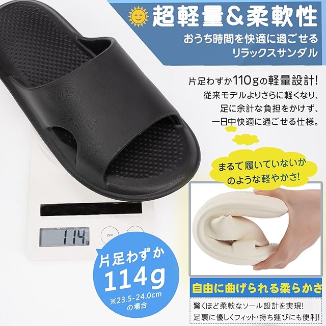 【超軽量&静音設計おうち時間を快適にするリラックスサンダル】片足わずか110gの超軽量設計で、まるで履いていないかのような軽やかさ!長時間履いても足に負担をかけず、一日中快適に過ごせます。さらに、歩くたびに「パタパタ」と響く音を軽減する静音設計を採用。フローリングを傷つける心配もなく、オフィスにいる時間や早朝・深夜の移動も安心。新築の家や集合住宅でも気兼ねなく使用できます。毎日の暮らしに寄り添い、家族みんなが心地よく過ごせる暖かな空間をサポートする、優しさにこだわったサンダルです。