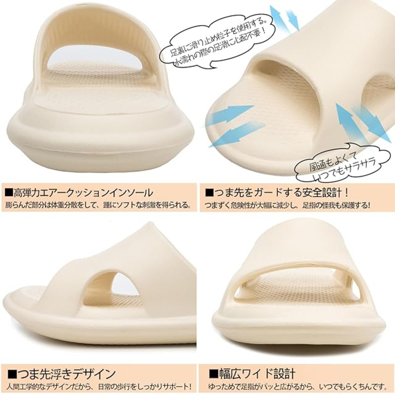 【シャワー室でも清潔を保つ抗菌・防臭&丸洗い可能】環境に配慮した最新EVA素材を使用し、Ag+抗菌加工を施しているため、イヤなニオイを防ぎ、清潔な状態をキープ。汚れがつきにくく、水洗い可能で、お手入れも簡単です。通気性と排水機能が強化されたデザインで、水が溜まりにくく、速乾性も抜群。かかと部分のオープンデザインがムレを防ぎ、夏場でも快適に過ごせます。浴室や水回り、プールサイドなど、シーズンを問わず使える万能サンダルです。