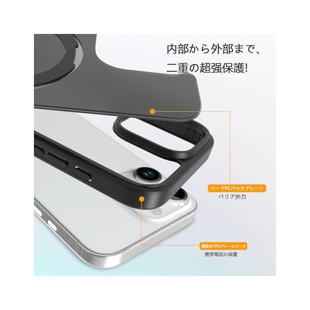 【対応電話モデル】iPhone ケース MagSafe対応・スタンド機能 スマホケース。正確な穴設計。カメラレンズの全面保護。注:購入時にモデルが正しいかどうかを確認してください。<br> 【MagSafe対応・超強磁力】1,900 gの吸着力を備えた強力な内蔵磁石により、吸着力を高めて、安定感をアップしてエネ損失なしの快速ワイヤレス充電できる。様々な状況で安定した状態を保ちます。MagSafeバッテリー、MagSafeカードケース、MagSafeワイヤレス充電器、MagSafeリング、車載スタンドなど様々なMagSafeニーズに対応、Magsafeの便利さを満喫しましょう!<br> 【スタンド機能】多機能スタンドとリング一体型の斬新なデザインです。隠しスタンドの設計で、省スペース性に優れ、収納するときは水平的に置けできて、持ち運びの邪魔になりません。縦置きでも横置きでも安定して支えられ、40°~ 120°の間で多角度自由に調整できます。FaceTimeでも動画でも両手が完全に解放されます。携帯性からもファッション性からも唯一無二の存在です。<br> 【半透明・マットな質感】背面が透ける特性を汲み取ったデザインで、iPhoneのかっこいいリンゴロゴが薄っり見えて、高級感と神秘感が溢れている。背面のポリカーボネートは耐久性や耐摩耗性に優れ、長く使っても綺麗に見え。スマホに近い感覚を味わうことができ。<br> 【高耐衝撃性・カメラ保護】免震構造である高弾力バンパーと耐震構造である丈夫なポリカーボネート背面で組み合わせて、バランスが良く落下衝撃を本体に伝えにくくなる。隆起エッジにより、スマホを置いた時にスクリーンやカメラが擦れにくくなり、傷から保護することができます。<br> 【品質保証】iPhone ケースを安心してお使いいただくために、当店は製品に関する品質保証を提供します。製品に不具合がある場合、注文履歴画面より出品者にご連絡いただき、お問い合わせ内容に応じて、交換などの対応が可能です。<br>