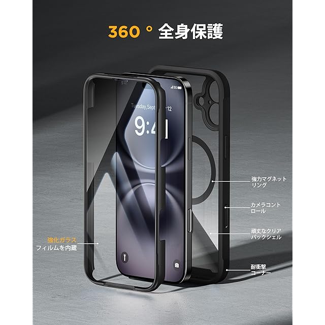 Miracase iPhone16 ケース MagSafe対応 スマホケース いPhone16 用 カバー 9H 強化ガラス 360°保護 全身バンパー保護ケース 6.1インチ フルカバー ワイヤレス充電対応 マグセーフ対応 マグネット搭載 黒