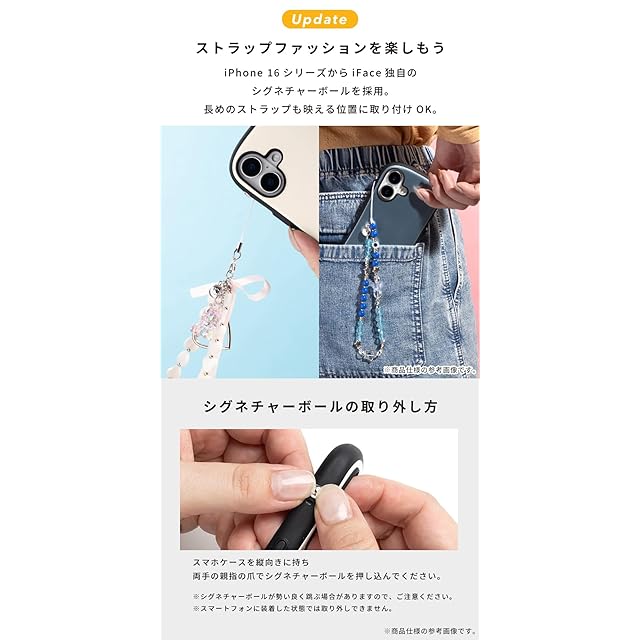 選べる2カ所のストラップホール / シグネチャーボール搭載でストラップの付け方が広がる / iFaceストラップホルダー専用設計でショルダーストラップの使いやすさアップく ※ストラップホルダーを併用する場合は、iFaceから発売している製品をご使用ください。類似品ではiFaceケースと併用の使用感を保証しかねるため、ご注意ください。