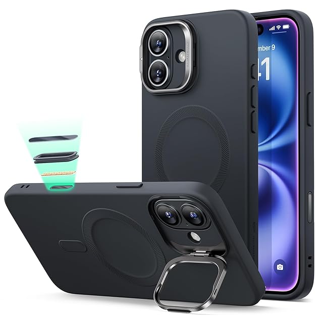【デザイン受賞シリーズ!】ESR iPhone 16 ケース カメラコントロール スタンド付きシリコンケース 米軍MIL規格の保護 隠れスタンド アイフォン16 ケース iPhone16ケース対応 iPhone 16用マグネットスマホケース Cloudシリーズ ブラック
