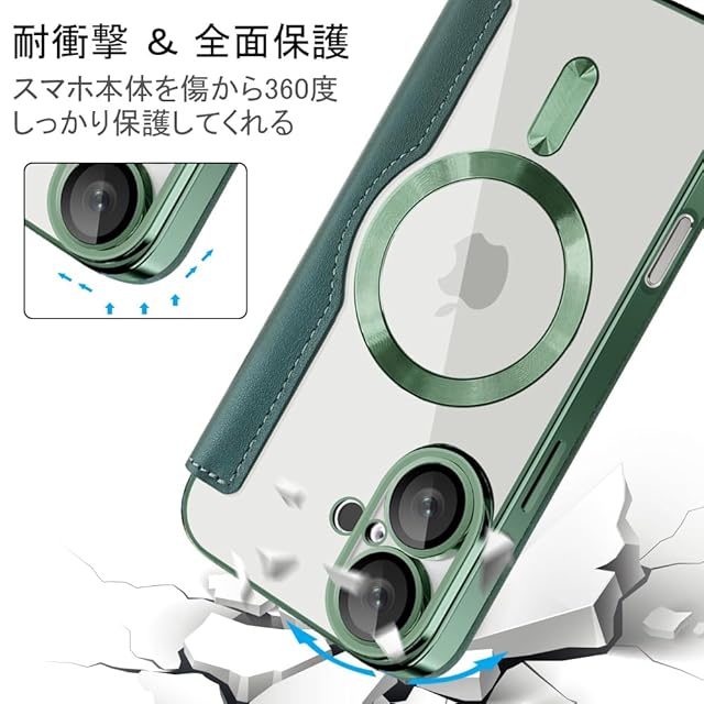 【REHOOF】iPhone 16 ケース 手帳型 magsafe対応 6.1インチ 背面 透明 クリア 財布型 アイフォン 16 ケース マグセーフ 手帳 ワイヤレス充電対応 カード入れ PU革 レザー スマホケース 軽量 薄型 防塵 耐衝撃 全面保護 スマホカバー(グリーン)