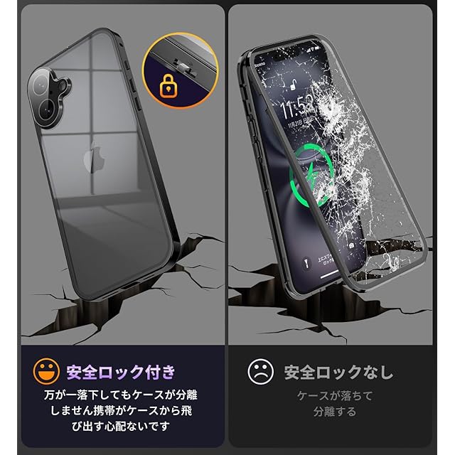 【両面9H強化ガラス・高感度タッチ】このiPhone16 ケースは、9H硬度ガラス素材を採用されて、鍵やカッターなどの鋭利なもので切りつけてもキズが付きにくく、耐衝撃性と耐傷性に優れています。両面9H強化ガラス + ロック機能付きメタルフレームの組み合わせにより、落下保護が向上し、iPhone16を全方位からしっかりと守れます。前カバーの画面、3Dタッチ機能により、応答性能が優れています。特殊コーティング技術でスムースな指すべりで操作性アップでゲームをしても楽しめます。注意:画面保護フィルムを貼ってる必要はありません、操作反応が低下します。