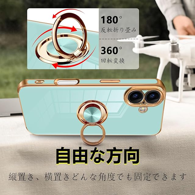 MiaoKeDa iPhone 16 ケース リング 耐衝撃 いphone16 リング付き スマホケース TPU 車載ホルダー ストラップホール付き メッキ加工 カバー ライトシアン