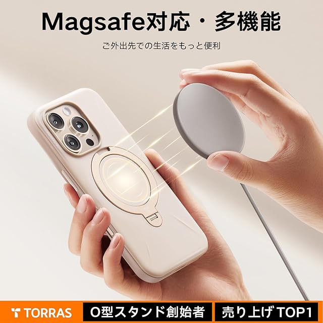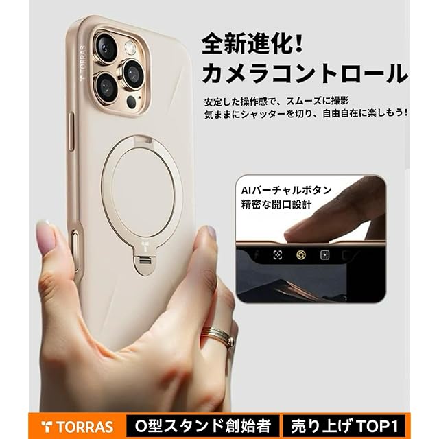 【新型ゼンマイ式 ・高級ミルクティー】TORRAS iPhone 16 Pro 用 ケース ゼンマイ式スタンド縦横両対応 リング マグネット搭載 MagSafe対応 ワイヤレス充電対応 米軍規格耐衝撃 指紋防止 黄変防止 マグセーフ対応 6.3インチ「Ostand Spin Fusion」ミルクティー・デザートチタニウム
