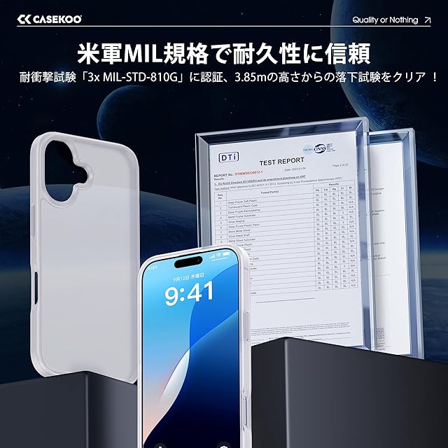 【米軍MIL規格・指紋防止】CASEKOO iPhone 16 用 ケース 耐衝撃 滑り止め 指紋防止 米軍MIL規格 マット仕上げ ストラップホール付き 黄変防止 耐久性 カバー ワイヤレス充電対応 アイフォン 16 用 6.1 インチ ケース(マットクリア)