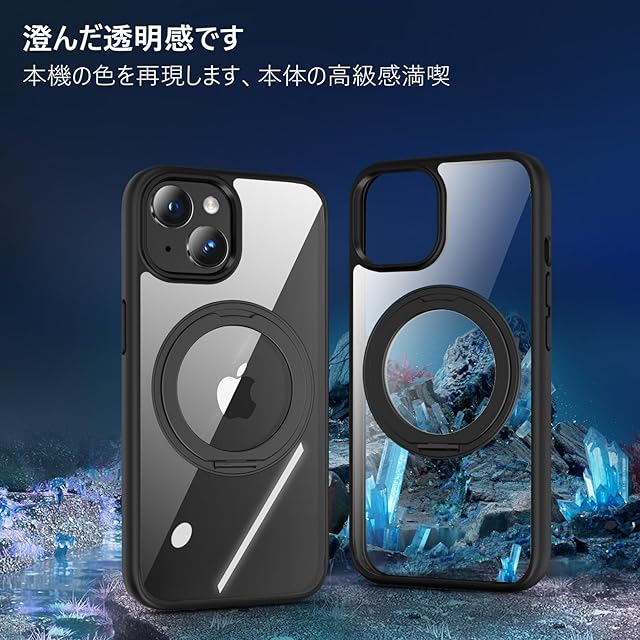 【360度回転スタンド・縦横両対応】KATSUTOYO iPhone 14 用 ケース magsafe 黄ばみにくい iphone13 用 ケース 強磁力リング マグネット搭載 360°回転スタンド 縦横両対応 MagSafe対応 高耐久性 米軍MIL規格 耐衝撃 指紋防止 (6.1インチ)背殻クリア ブラック