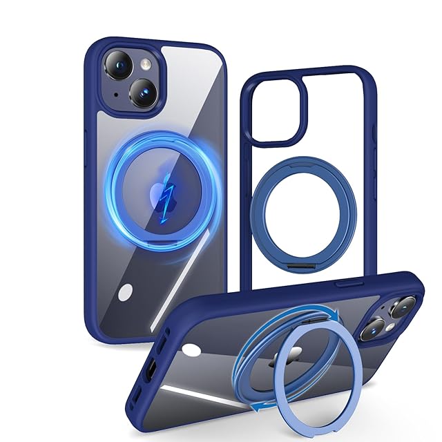 【360度回転スタンド・縦横両対応】KATSUTOYO iPhone 14 用 ケース magsafe 黄ばみにくい iphone13 用 ケース 強磁力リング マグネット搭載 360°回転スタンド 縦横両対応 MagSafe対応 高耐久性 米軍MIL規格 耐衝撃 指紋防止 (6.1インチ)背殻クリア ブルー