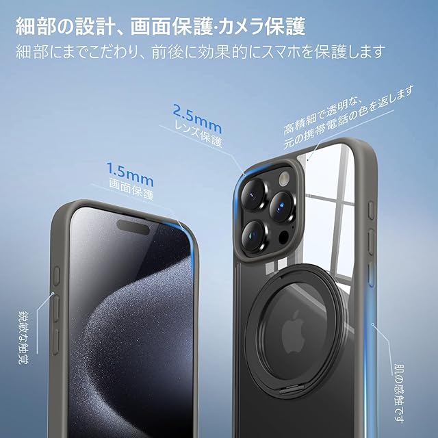 【縦横360度自由回転】iPhone 15 Pro(三眼カメラ、6.1インチ)専用。アップグレードされた360度回転軸はよりスムーズに回転し、静かでスムーズな回転を実現します。ブラケットのマルチアングル回転により、使用機能が充実します。お好みに合わせて調整でき、スタンドはお好みの角度に機能を調整できます。縦持ちでも横持ちでも、スマートフォンをしっかりと支えられるスタンドです。自然な姿勢でYouTubeや映画、動画視聴、ビデオ通話などを楽しめます。 (iphone 15 pro ケース)