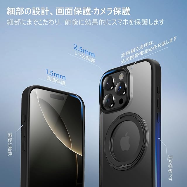 【縦横360度自由回転】アップグレードされた360度回転軸はよりスムーズに回転し、静かでスムーズな回転を実現します。ブラケットのマルチアングル回転により、使用機能が充実します。お好みに合わせて調整でき、スタンドはお好みの角度に機能を調整できます。縦持ちでも横持ちでも、スマートフォンをしっかりと支えられるスタンドです。自然な姿勢でYouTubeや映画、動画視聴、ビデオ通話などを楽しめます。 iPhone 16promax 用(6.9インチ)の保護ケースです。(いphone16promax 用 ケース)
