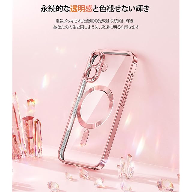 メタリックな光沢デザイン: このケースは iPhone 16 専用に設計されています。透明な背面を維持しながら、エッジ、カメラ、磁気リングはメタリックな光沢で装飾されており、本当にユニークです。電気メッキプロセスにより、このケースは輝く色になり、色あせたり剥がれたりすることはありません。