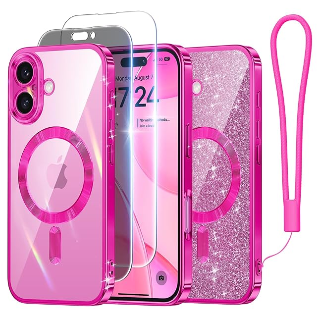 Meifigno ケース iPhone 16 Plus 6.7インチ用 [MagSafe対応] [クリア 1 枚 + プライバシー スクリーン プロテクター 1 枚] [グリッターカード&リストストラップ] サラウンドレンズ保護 iPhone 16 Plusケース用 ホットピンク