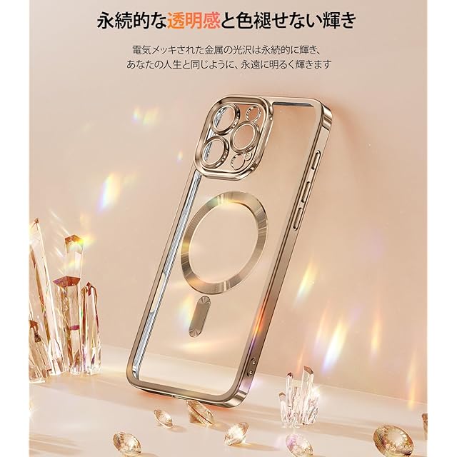 メタリックな光沢デザイン: このケースは iPhone 16 Pro 専用に設計されています。透明な背面を維持しながら、エッジ、カメラ、磁気リングはメタリックな光沢で装飾されており、本当にユニークです。電気メッキプロセスにより、このケースは輝く色になり、色あせたり剥がれたりすることはありません。