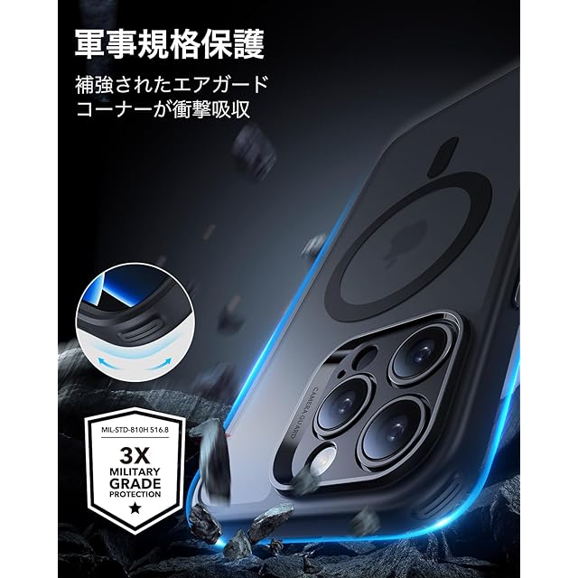 【軍事規格の保護力】衝撃吸収エアガードコーナーと強化ガラススクリーン保護フィルムとカメラレンズ保護フィルムを併用することで、落下、衝撃、傷からスマホを保護します。対応機種:iphone16pro ケース