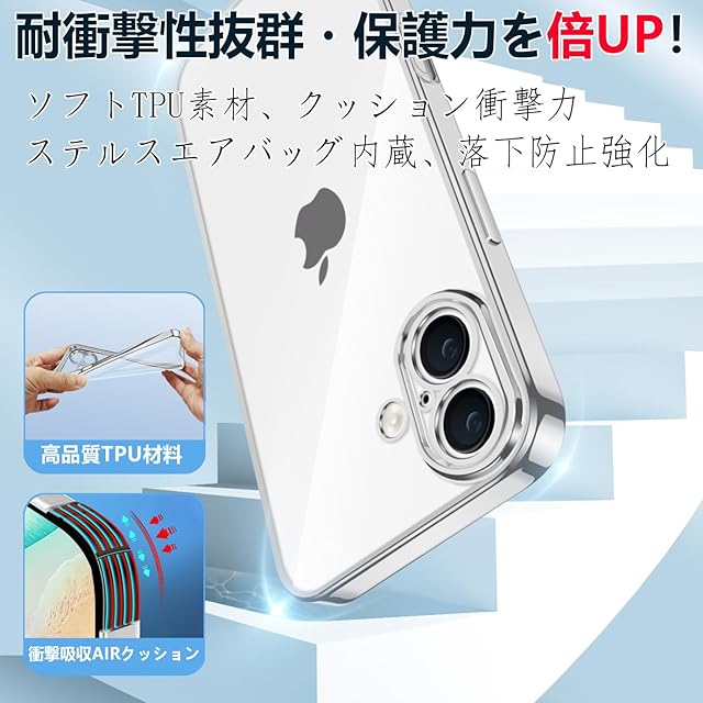 iPhone16 Plus 用 ケース クリア 透明 アイフォン16 Plus カバー 耐衝撃 TPU 素材 メッキ枠 薄型 軽量 ソフト メッキ加工 黄ばまない 米軍規格 人気 可愛い おすすめ (シルバー)
