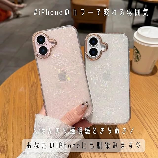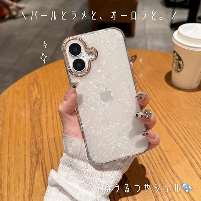 ナチュラルで可愛い“パールシェル風”のデザインに、きらめくパウダーラメをたっぷり散りばめた、まさに"映え"を叶えるiPhoneケース♡ 手に持つだけでテンションUP!光に当たるとふんわり輝くから、**ネイルやリングとの相性も抜群◎**