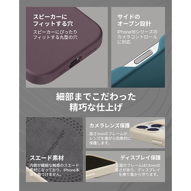 【細部までしっかり保護】iPhone 16 Pro Maxに設計されたカメラレンズ保護は、高さ1mmのフレームがあり、レンズを傷から効果的に保護します。 ケースの内側には繊細な触感のスエード素材を採用し、iPhone本体に傷がつくのを防ぎます。正面のフレームは1.3mmの高さがあり、ディスプレイを擦り傷から守ります。iPhone 16 Pro Maxのスピーカーにぴったりフィットする丸型の穴によって、外観の美しさをより高めるだけでなく、音質保護も向上させます。