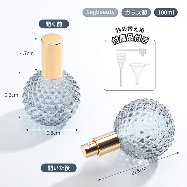 【詰め替え用付属品付き】<br />香水瓶などから香水を入れ替える際に便利な付属品をセットでお付けします。アトマイザー*1点+プッシュノズル*1点+スポイト*1点+漏斗*1点。容量:100ml、カラー:グレー。<br /> <br /> 【たっぷり収納&華やかなデザイン】<br />100mlの大容量で、たっぷりと香水を保存可能。日常使いに最適なサイズで、詰め替えの手間を減らします。エレガントで華やかなデザインはインテリアとしても魅力的。お気に入りの香りをスタイリッシュに保存できます。<br /><br /> 【漏れ防止・長時間の香りを保持】<br />ガラスは非常に耐久性が高く、化学的に安定しているため、高密閉性により香水をしっかりと閉じ込めることができます。フレグランスを密封し、外部の空気や光から保護するため、香りを長時間持続させることができます。これにより、持ち運びや保管時にも安心して使用することができます。<br /><br /> 【香水以外の液体も使用可能】<br />ガラスは透明であるため、リキッドの残量が一目で確認でき、リキッドを補充できます。香水以外にも、化粧水やヘアスプレーやアルコール対応などの詰め替えにも使用可能です。このため、小分けボトルとして様々な用途に使え、非常に便利です。<br /><br /> 【購入後のサポート】<br />初期不良につきましては商品到着日から30日間、製品保証が適応されます。なお、商品使用について、なにかご不明な点がありましたら、弊社へお気軽にお問い合わせしてください。<br />