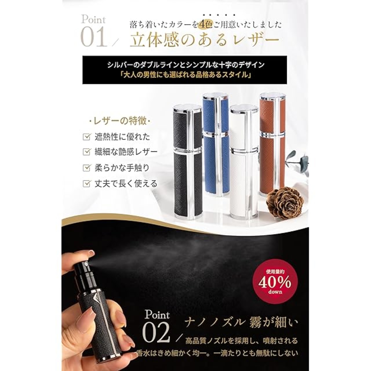 【超微細ミスト・贅沢な香りを無駄なく】独自設計のノズルにより、極細ミストを均一に噴霧し、ふんわりと香りが広がります。ひと吹きで心地よく香りをまとい、余分に使いすぎる心配もありません。大切な香水を一滴も無駄にしません