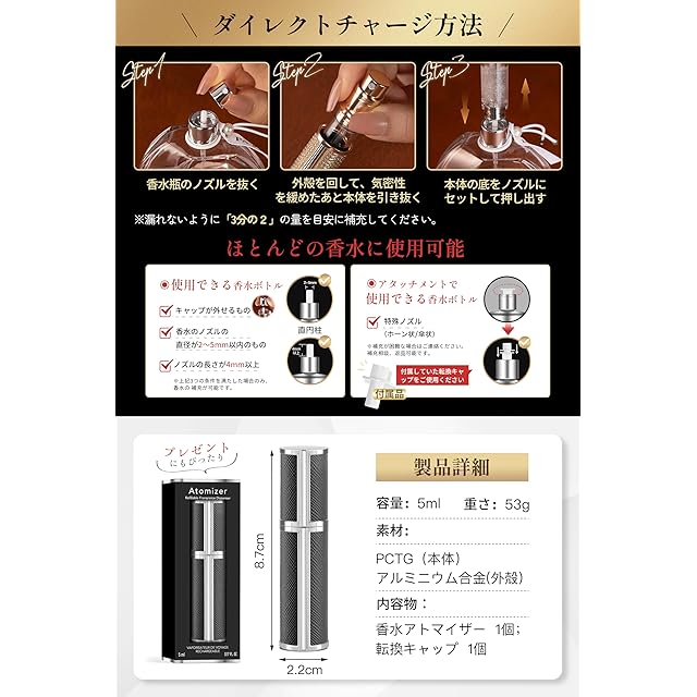 【詰め替え超簡単・わずか3ステップ】STEP1:香水瓶のノズルを抜きます。STEP2:本体を軽く回して、気密性を緩めた後、スムーズに引き抜きます。STEP3:本体の底をノズルにセットして押し出します。新しいアップグレードにより、直径2~3mmまたは3~5mmの直円形ノズルを持つあらゆる香水瓶を直接詰め替え可能です。特殊ホーン状や傘状のノズルにも、付属転換キャップで対応します