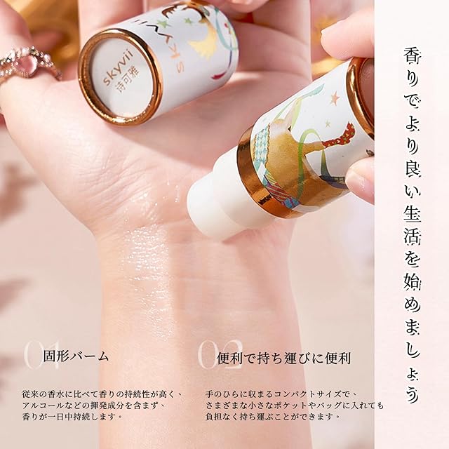 【バームの特徴】 従来の香水に比べて香りの持続時間が長く、アルコールなどの揮発性物質を含まず、刺激感がなく、香りが一日中持続します。