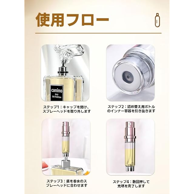 【注意事項】オリジナルの香水スプレーノズルのサイズ:1. 取り外し可能な香水キャップ;2. スプレーノズルの直径が2〜5mm、長さが4mm以上。香水スプレーノズルの種類:直線型/円柱型は充填可能。使用できないノズルの種類:5mm以上のキノコ型、傘型などは再充填不可。