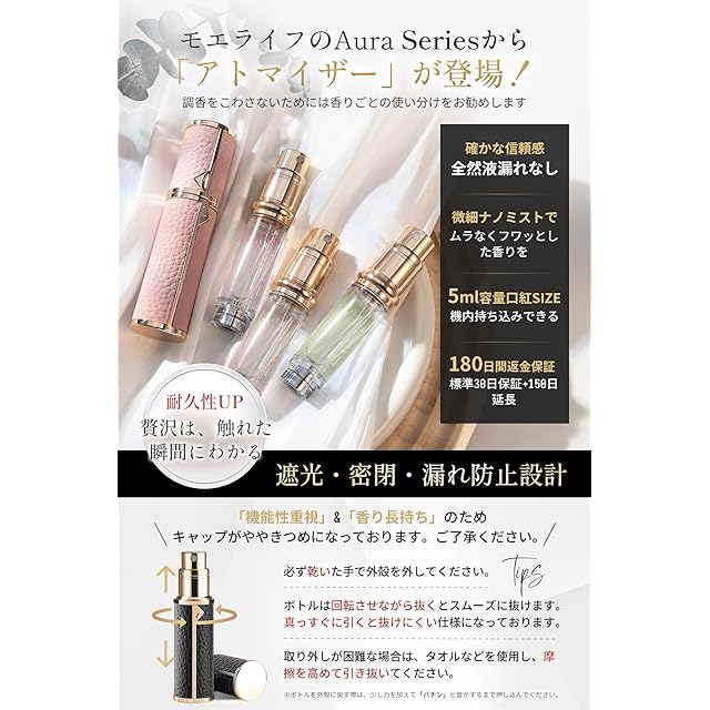 【詰め替え超簡単・わずか3ステップ】STEP1:香水瓶のノズルを抜きます。STEP2:本体を軽く回して、気密性を緩めた後、スムーズに引き抜きます。STEP3:本体の底をノズルにセットして押し出します。新しいアップグレードにより、直径2~3mmまたは3~5mmの直円形ノズルを持つあらゆる香水瓶を直接詰め替え可能です。特殊ホーン状や傘状のノズルにも、付属転換キャップで対応します