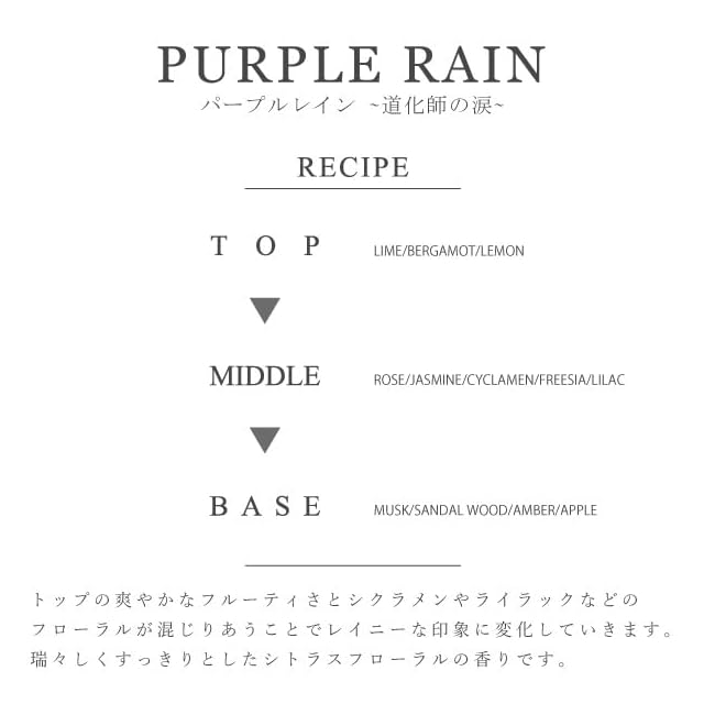 道化師の涙 「どこまでも紫色に透き通る雨」がテーマの香り。<br> しっとりとした落ち着きの中にある、小さいけれど決して消えることの無い炎をイメージさせる。<br> トップは爽やかでフルーティな香りから始まり、ラストにはシクラメン・ライラックなどのフローラルが混じりあうことでレイニーな印象に変化していきます。<br><br> 【こんな方におすすめ】<br> 落ち着いたフローラルの香りをお探しの方、柔軟剤の様な香りがお好きな方へ。<br><br> 【スタッフワンポイントレビュー】<br> 瑞々しくすっきりとしたシトラスフローラルが、頭の回転の速さや天才肌の人物を思わせる香りです。<br><br> 【おすすめパイルアップ】<br> ・パープルレイン×ハーネラ<br> (高貴でミステリアスな雰囲気の、媚びない色気を感じさせるフローラルティーの香りの組み合わせ)<br> ・シルウイスパー×パープルレイン<br> (紫色を彷彿とさせる花々の妖艶さと高潔でフレッシュなシトラスが楽しげに絡み合う魅惑の香りの組み合わせ)<br><br> ※ボトルの個体差により商品ページの容量(水位)と多少誤差がある商品もございますことをご了承ください。規定量以上は充填されておりますのでご安心ください。<br>※香料由来により液体色が黄みがかっている場合がありますが、品質や香りに問題はございません。